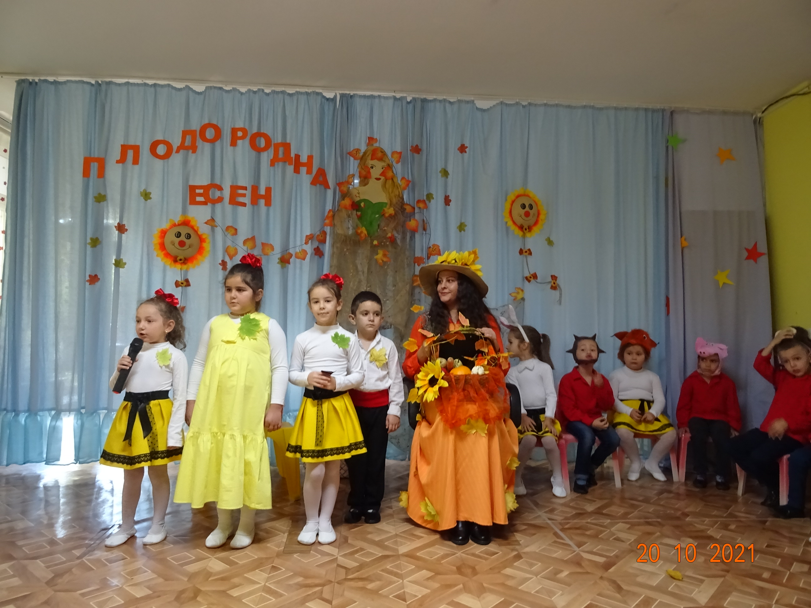 "Плодородна есен" - есенен празник 25 окт 2021 Есента е вече тук, с много плод и зеленчук! Духат силни ветрове, падат хладни дъждове... https://www.youtube.com/watch?v=xFHqpP1ejCA