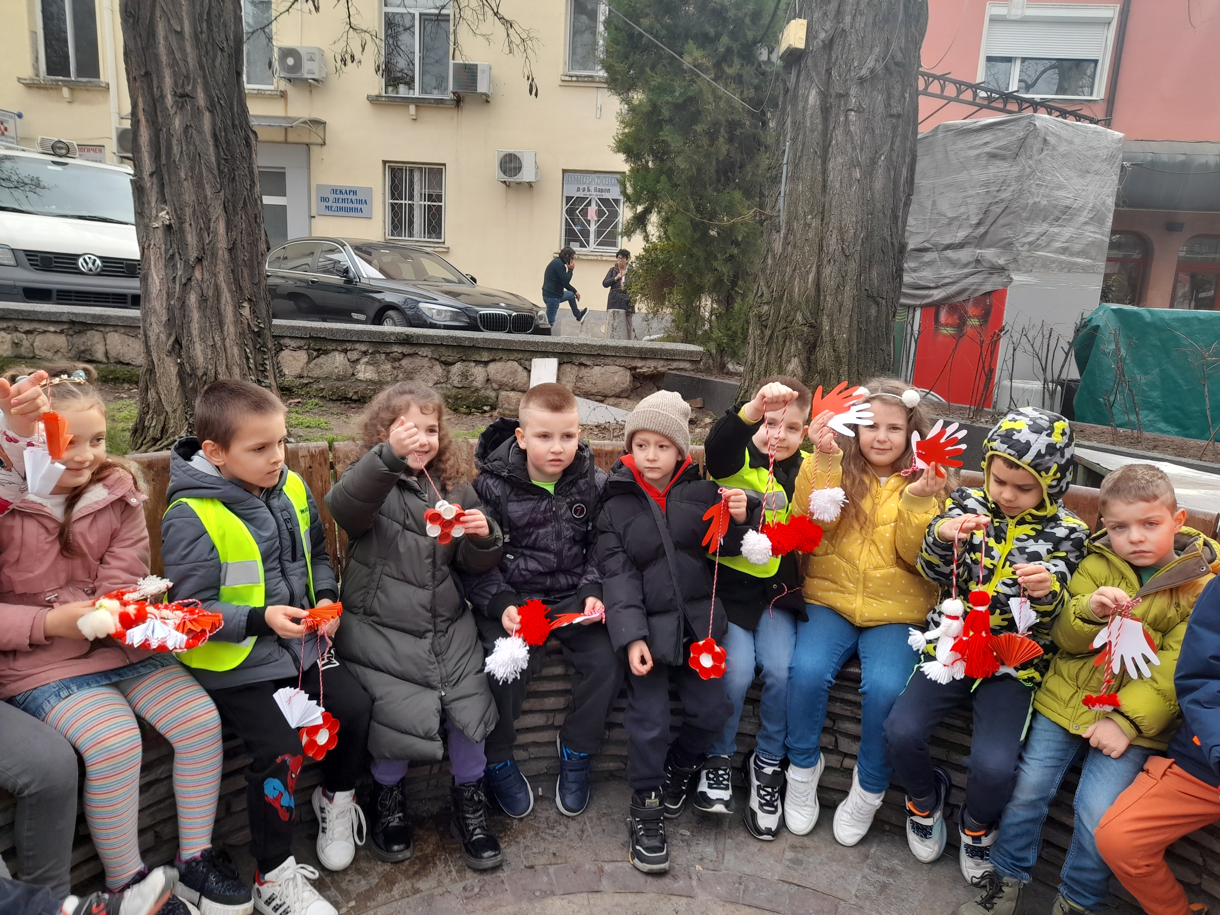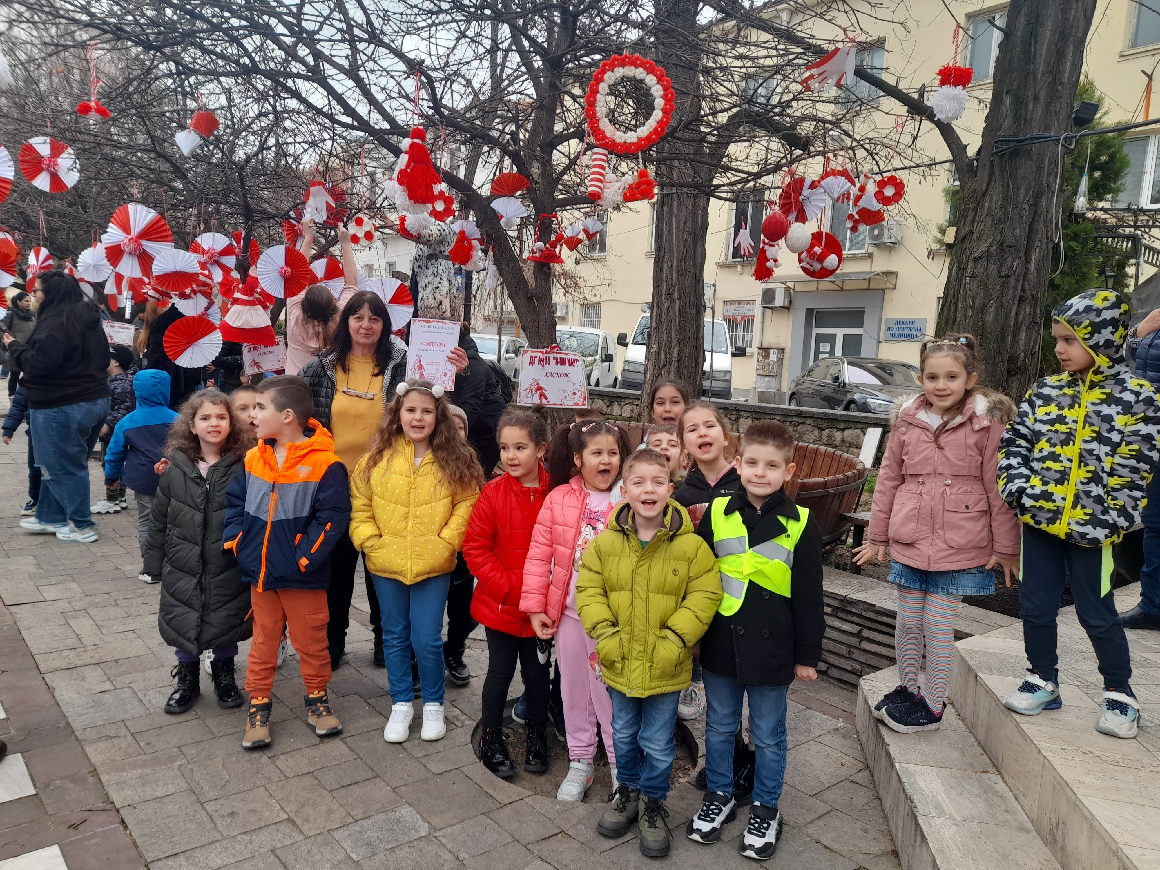Нашите деца от ПГ също се включиха в празничната украсата на града ни и накичиха с красиви мартенички едно от дърветата.
