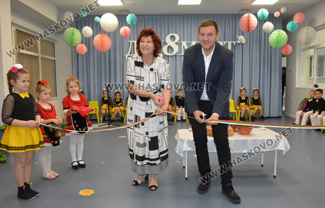 Г-жа Гергана Бойчинова - Директор на ДГ " Осми март" и г-н Станислав Дечев - Кмет на Община Хасково, прерязаха лентата на обновената детска градина по Инвестиционен проект " Реконструкция и разширение на ДГ".